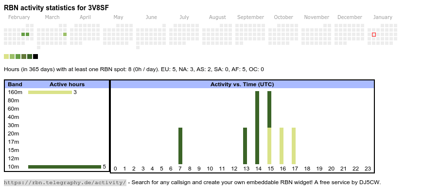 The heatmap shows the activity as reported by the RBN (CW/PSK/RTTY, no FT8) of the last 12 months. You can scroll back to January 2015.
