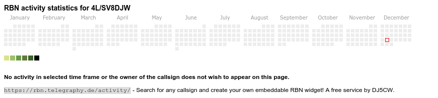 The heatmap shows the activity as reported by the RBN (CW/PSK/RTTY, no FT8) of the last 12 months. You can scroll back to January 2015.