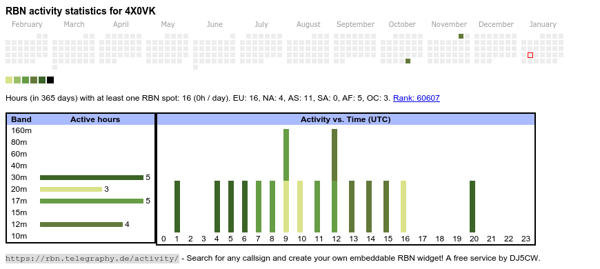 The heatmap shows the activity as reported by the RBN (CW/PSK/RTTY, no FT8) of the last 12 months. You can scroll back to January 2015.