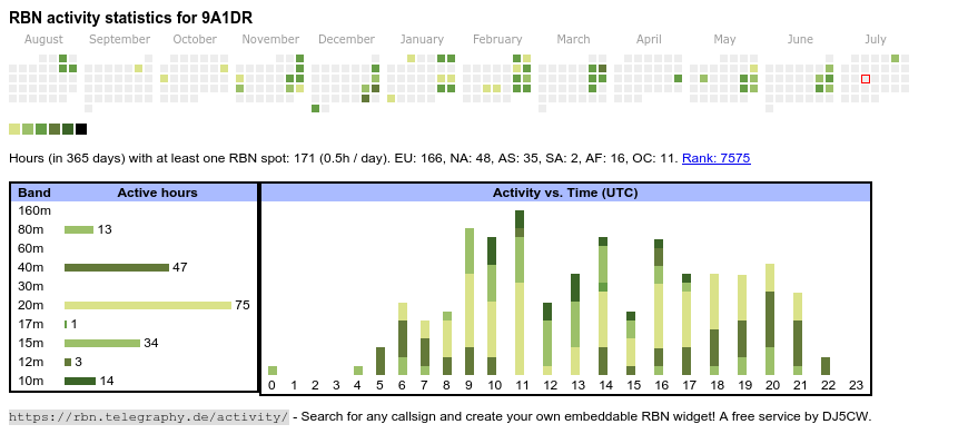 The heatmap shows the activity as reported by the RBN (CW/PSK/RTTY, no FT8) of the last 12 months. You can scroll back to January 2015.