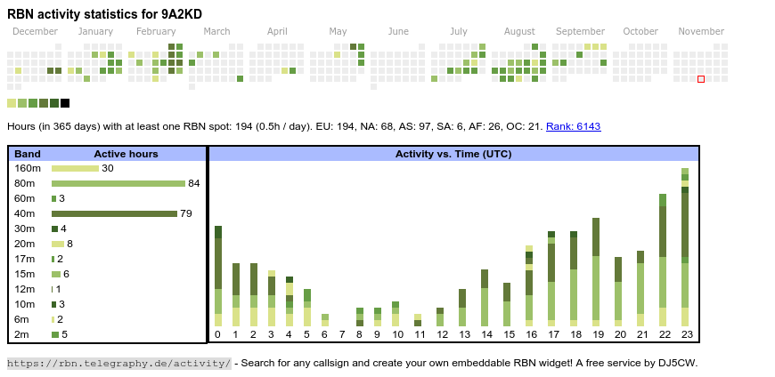 The heatmap shows the activity as reported by the RBN (CW/PSK/RTTY, no FT8) of the last 12 months. You can scroll back to January 2015.