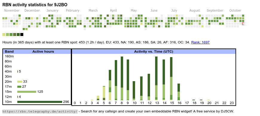 The heatmap shows the activity as reported by the RBN (CW/PSK/RTTY, no FT8) of the last 12 months. You can scroll back to January 2015.