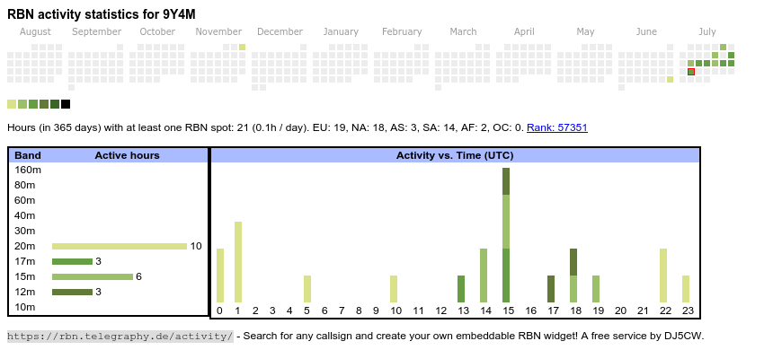 The heatmap shows the activity as reported by the RBN (CW/PSK/RTTY, no FT8) of the last 12 months. You can scroll back to January 2015.