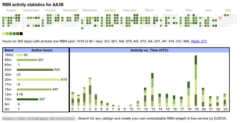 The heatmap shows the activity as reported by the RBN (CW/PSK/RTTY, no FT8) of the last 12 months. You can scroll back to January 2015.