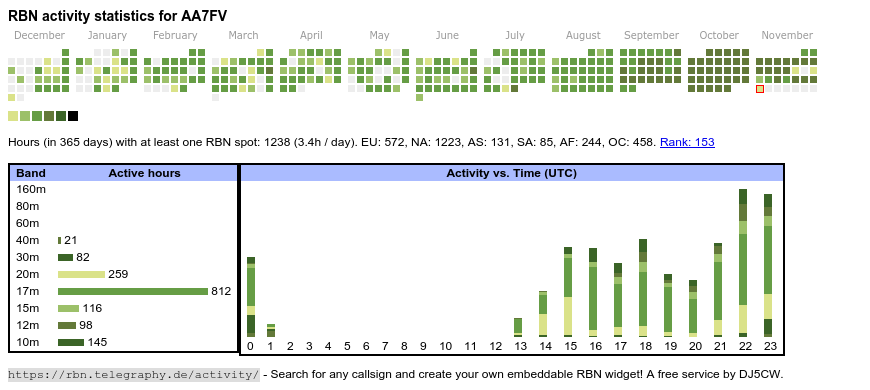 The heatmap shows the activity as reported by the RBN (CW/PSK/RTTY, no FT8) of the last 12 months. You can scroll back to January 2015.