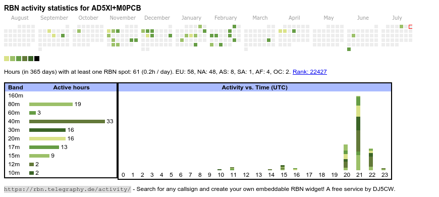 The heatmap shows the activity as reported by the RBN (CW/PSK/RTTY, no FT8) of the last 12 months. You can scroll back to January 2015.