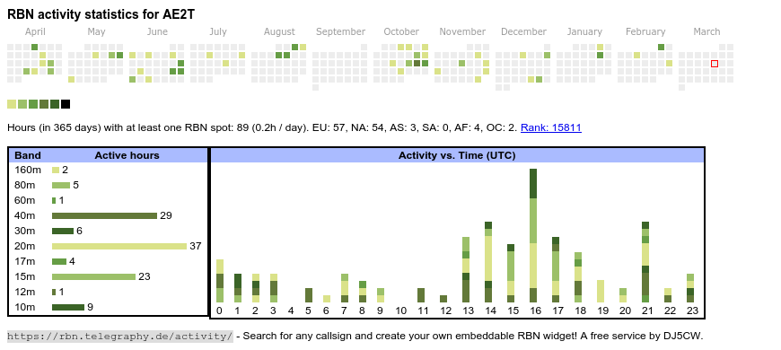 The heatmap shows the activity as reported by the RBN (CW/PSK/RTTY, no FT8) of the last 12 months. You can scroll back to January 2015.