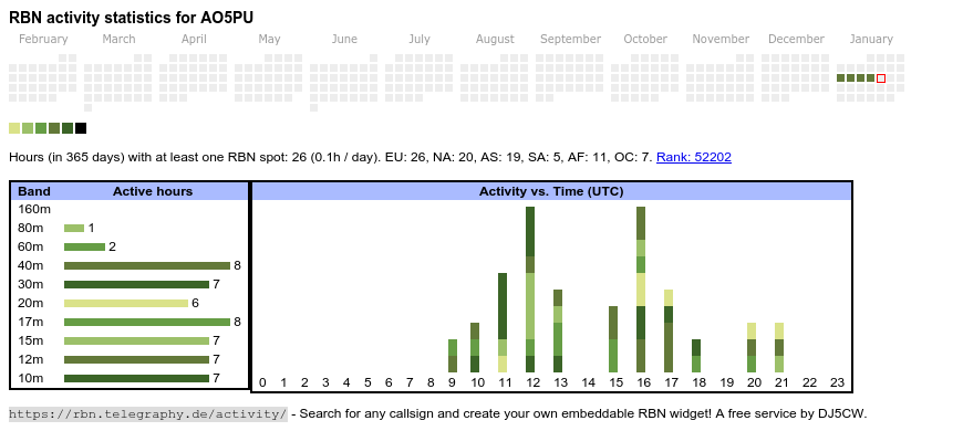 The heatmap shows the activity as reported by the RBN (CW/PSK/RTTY, no FT8) of the last 12 months. You can scroll back to January 2015.