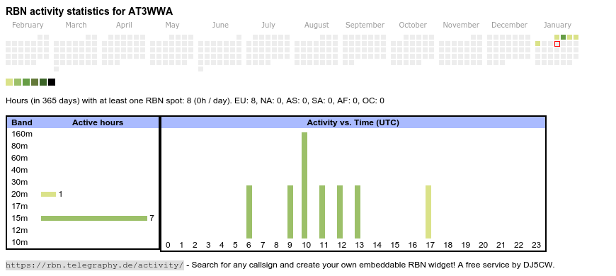 The heatmap shows the activity as reported by the RBN (CW/PSK/RTTY, no FT8) of the last 12 months. You can scroll back to January 2015.