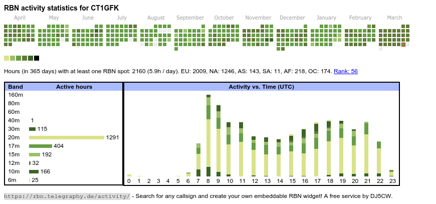The heatmap shows the activity as reported by the RBN (CW/PSK/RTTY, no FT8) of the last 12 months. You can scroll back to January 2015.