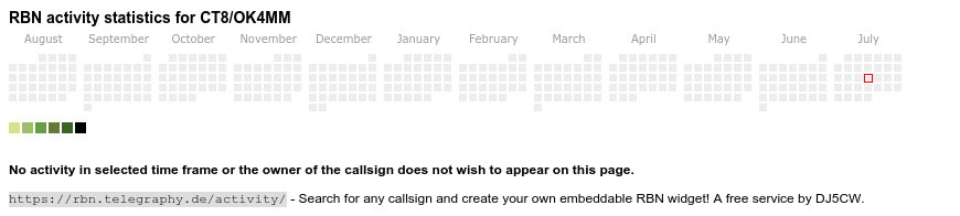 The heatmap shows the activity as reported by the RBN (CW/PSK/RTTY, no FT8) of the last 12 months. You can scroll back to January 2015.