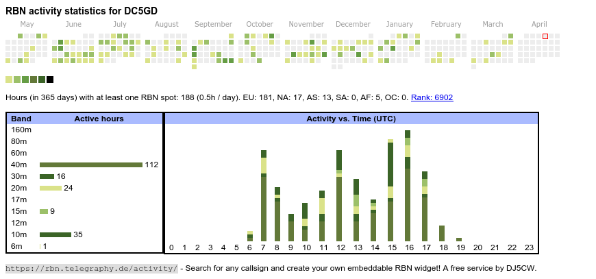 The heatmap shows the activity as reported by the RBN (CW/PSK/RTTY, no FT8) of the last 12 months. You can scroll back to January 2015.