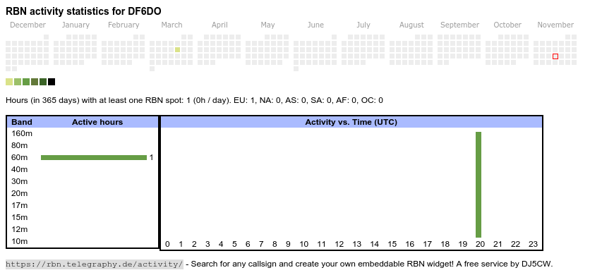 The heatmap shows the activity as reported by the RBN (CW/PSK/RTTY, no FT8) of the last 12 months. You can scroll back to January 2015.