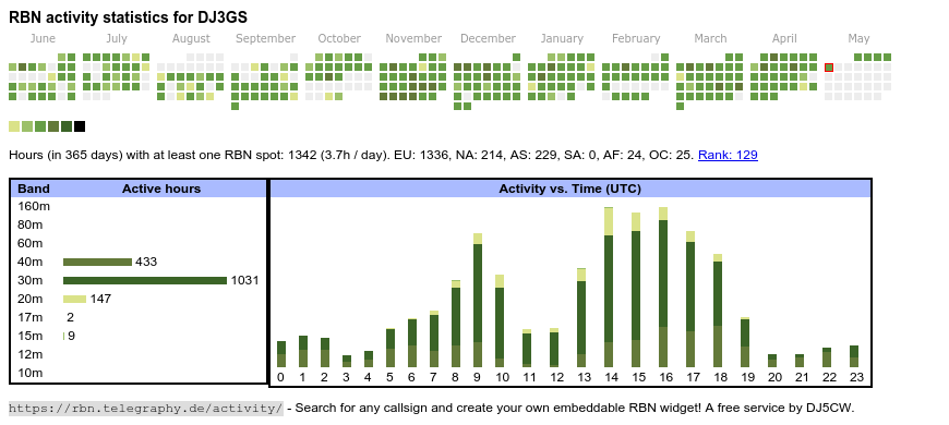 The heatmap shows the activity as reported by the RBN (CW/PSK/RTTY, no FT8) of the last 12 months. You can scroll back to January 2015.