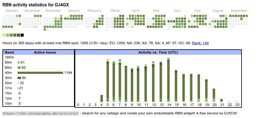 The heatmap shows the activity as reported by the RBN (CW/PSK/RTTY, no FT8) of the last 12 months. You can scroll back to January 2015.