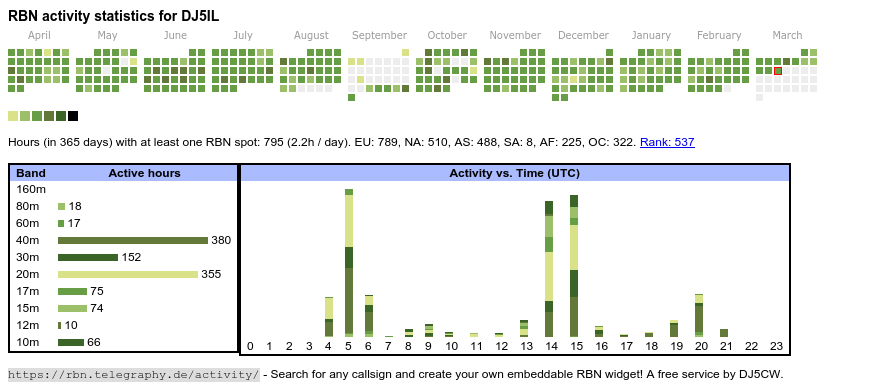 The heatmap shows the activity as reported by the RBN (CW/PSK/RTTY, no FT8) of the last 12 months. You can scroll back to January 2015.