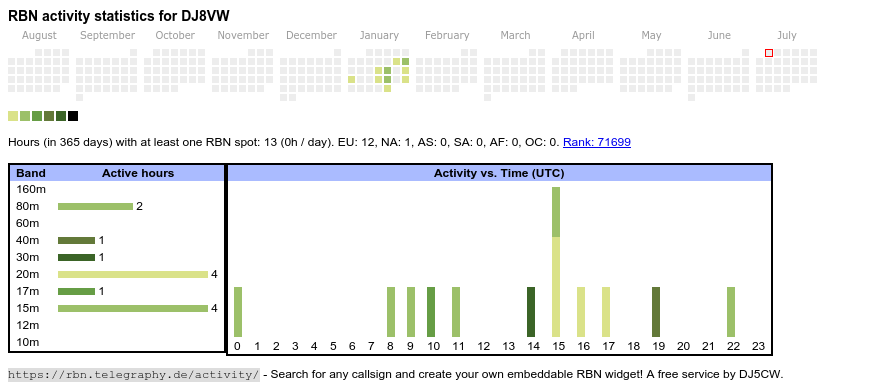 The heatmap shows the activity as reported by the RBN (CW/PSK/RTTY, no FT8) of the last 12 months. You can scroll back to January 2015.