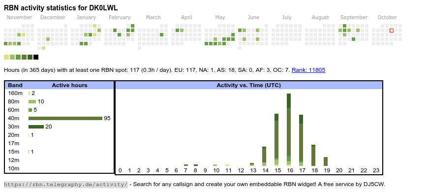 The heatmap shows the activity as reported by the RBN (CW/PSK/RTTY, no FT8) of the last 12 months. You can scroll back to January 2015.