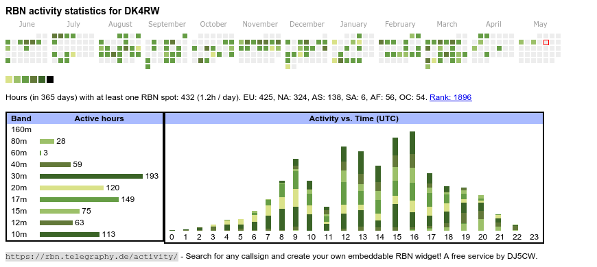 The heatmap shows the activity as reported by the RBN (CW/PSK/RTTY, no FT8) of the last 12 months. You can scroll back to January 2015.
