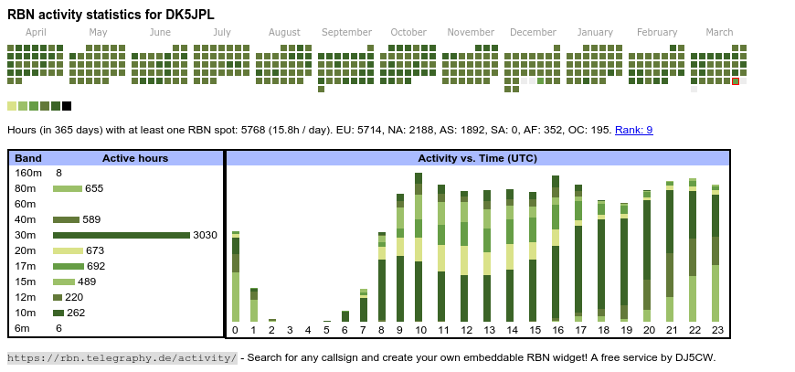 The heatmap shows the activity as reported by the RBN (CW/PSK/RTTY, no FT8) of the last 12 months. You can scroll back to January 2015.