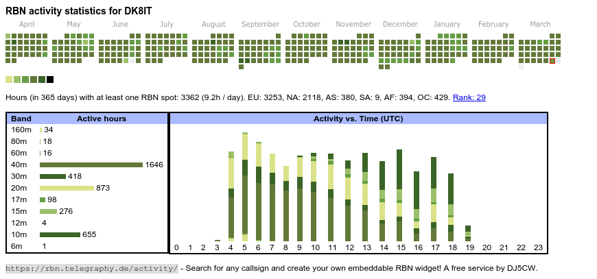 The heatmap shows the activity as reported by the RBN (CW/PSK/RTTY, no FT8) of the last 12 months. You can scroll back to January 2015.