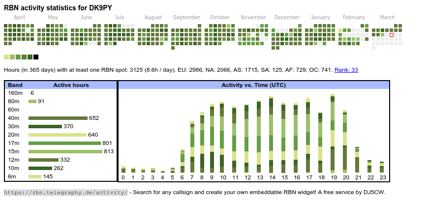 The heatmap shows the activity as reported by the RBN (CW/PSK/RTTY, no FT8) of the last 12 months. You can scroll back to January 2015.