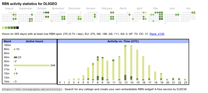 The heatmap shows the activity as reported by the RBN (CW/PSK/RTTY, no FT8) of the last 12 months. You can scroll back to January 2015.
