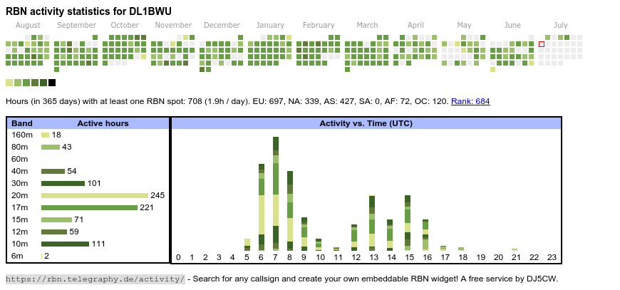 The heatmap shows the activity as reported by the RBN (CW/PSK/RTTY, no FT8) of the last 12 months. You can scroll back to January 2015.