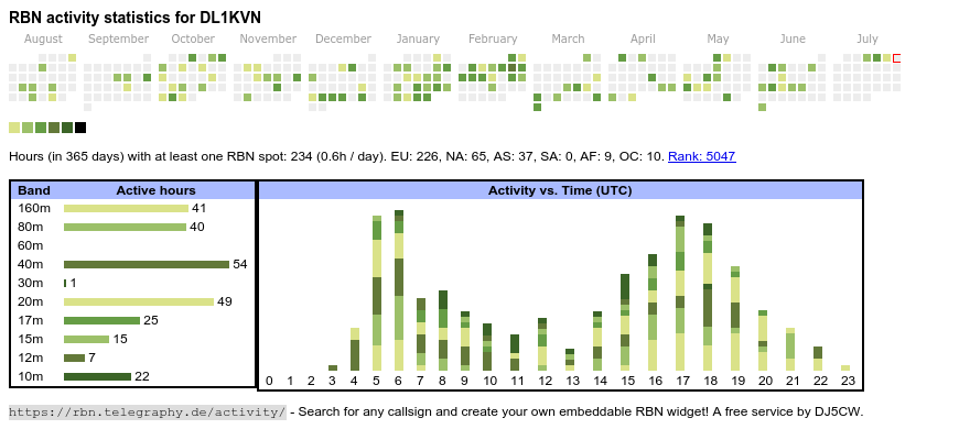 The heatmap shows the activity as reported by the RBN (CW/PSK/RTTY, no FT8) of the last 12 months. You can scroll back to January 2015.