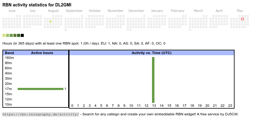 The heatmap shows the activity as reported by the RBN (CW/PSK/RTTY, no FT8) of the last 12 months. You can scroll back to January 2015.