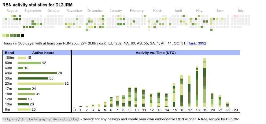 The heatmap shows the activity as reported by the RBN (CW/PSK/RTTY, no FT8) of the last 12 months. You can scroll back to January 2015.