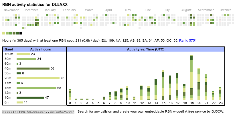 The heatmap shows the activity as reported by the RBN (CW/PSK/RTTY, no FT8) of the last 12 months. You can scroll back to January 2015.