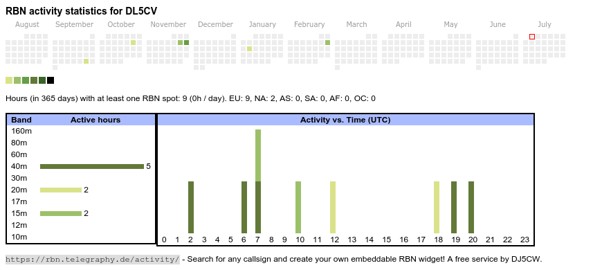 The heatmap shows the activity as reported by the RBN (CW/PSK/RTTY, no FT8) of the last 12 months. You can scroll back to January 2015.