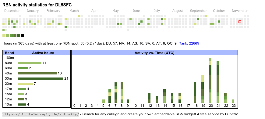 The heatmap shows the activity as reported by the RBN (CW/PSK/RTTY, no FT8) of the last 12 months. You can scroll back to January 2015.
