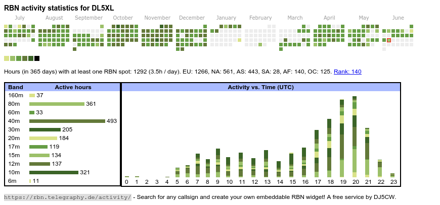 The heatmap shows the activity as reported by the RBN (CW/PSK/RTTY, no FT8) of the last 12 months. You can scroll back to January 2015.