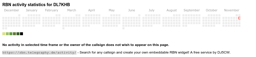 The heatmap shows the activity as reported by the RBN (CW/PSK/RTTY, no FT8) of the last 12 months. You can scroll back to January 2015.