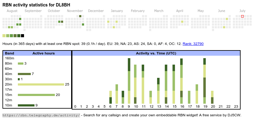 The heatmap shows the activity as reported by the RBN (CW/PSK/RTTY, no FT8) of the last 12 months. You can scroll back to January 2015.