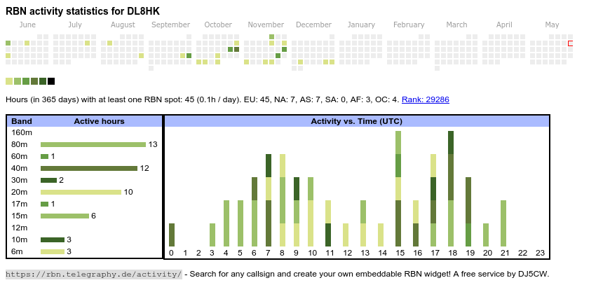 The heatmap shows the activity as reported by the RBN (CW/PSK/RTTY, no FT8) of the last 12 months. You can scroll back to January 2015.