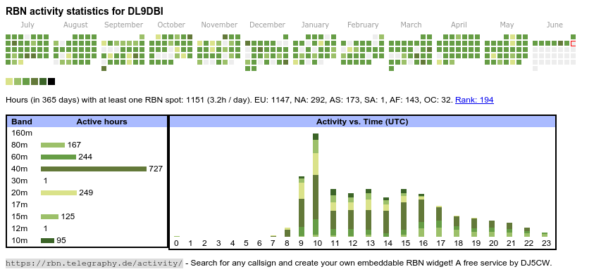 The heatmap shows the activity as reported by the RBN (CW/PSK/RTTY, no FT8) of the last 12 months. You can scroll back to January 2015.
