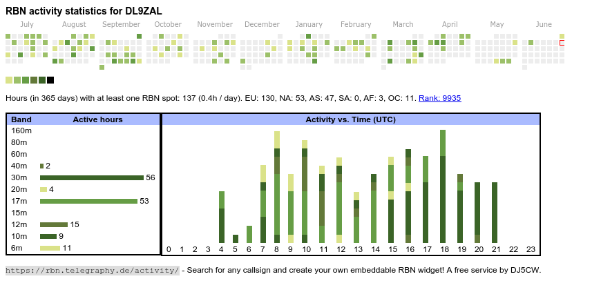 The heatmap shows the activity as reported by the RBN (CW/PSK/RTTY, no FT8) of the last 12 months. You can scroll back to January 2015.
