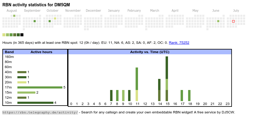 The heatmap shows the activity as reported by the RBN (CW/PSK/RTTY, no FT8) of the last 12 months. You can scroll back to January 2015.