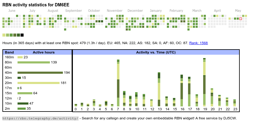 The heatmap shows the activity as reported by the RBN (CW/PSK/RTTY, no FT8) of the last 12 months. You can scroll back to January 2015.