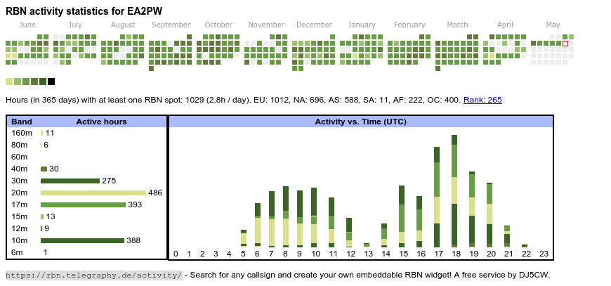 The heatmap shows the activity as reported by the RBN (CW/PSK/RTTY, no FT8) of the last 12 months. You can scroll back to January 2015.