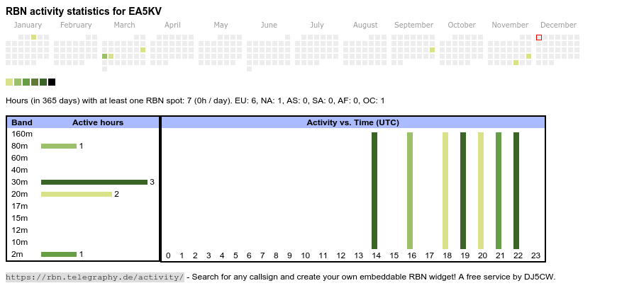 The heatmap shows the activity as reported by the RBN (CW/PSK/RTTY, no FT8) of the last 12 months. You can scroll back to January 2015.