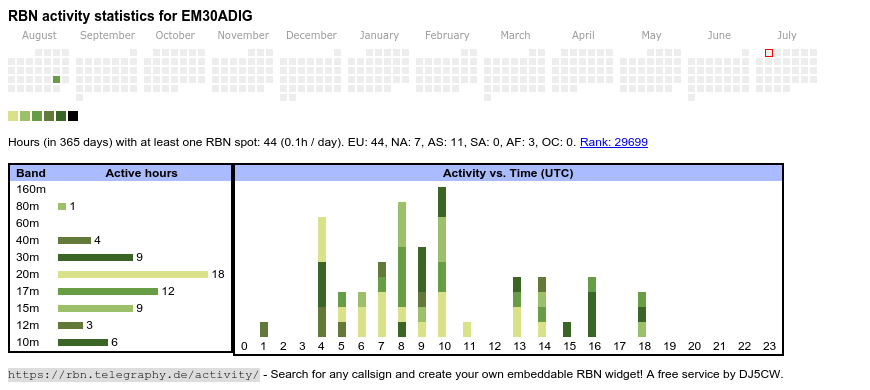 The heatmap shows the activity as reported by the RBN (CW/PSK/RTTY, no FT8) of the last 12 months. You can scroll back to January 2015.