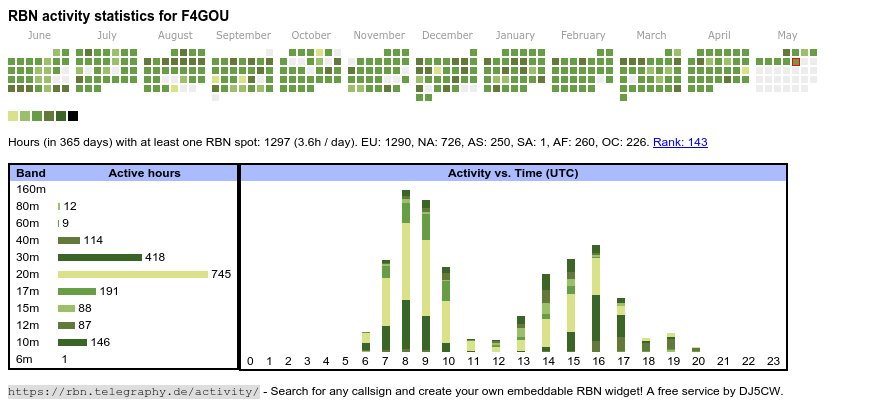 The heatmap shows the activity as reported by the RBN (CW/PSK/RTTY, no FT8) of the last 12 months. You can scroll back to January 2015.
