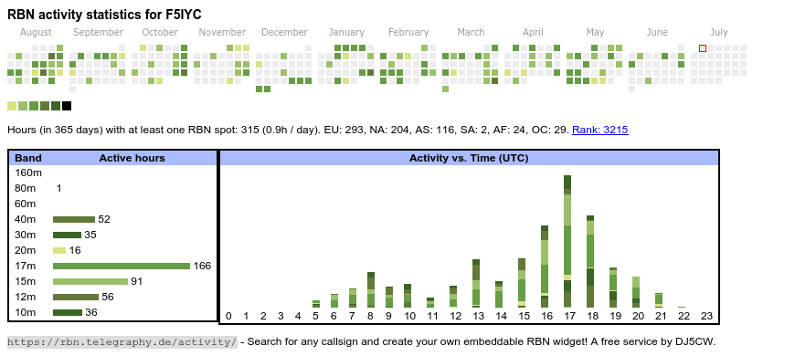 The heatmap shows the activity as reported by the RBN (CW/PSK/RTTY, no FT8) of the last 12 months. You can scroll back to January 2015.