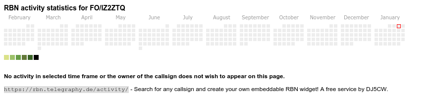 The heatmap shows the activity as reported by the RBN (CW/PSK/RTTY, no FT8) of the last 12 months. You can scroll back to January 2015.