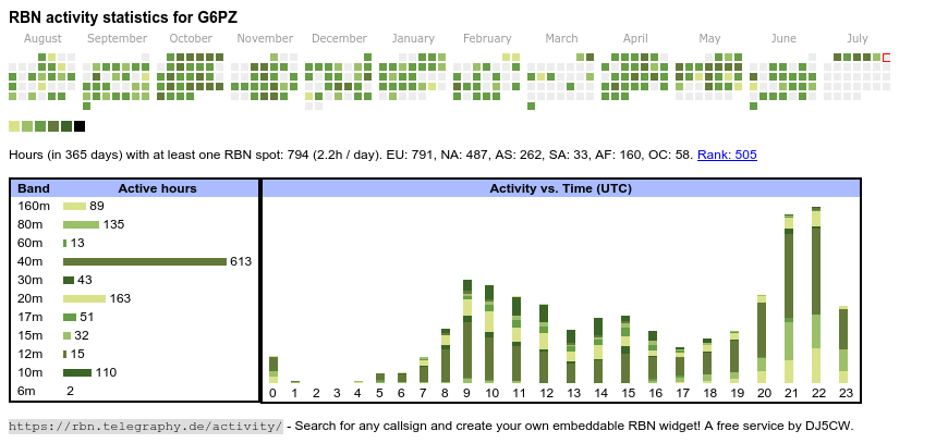 The heatmap shows the activity as reported by the RBN (CW/PSK/RTTY, no FT8) of the last 12 months. You can scroll back to January 2015.