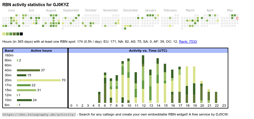 The heatmap shows the activity as reported by the RBN (CW/PSK/RTTY, no FT8) of the last 12 months. You can scroll back to January 2015.